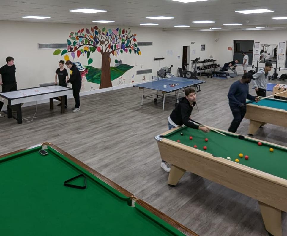 The Main House has a sports hall, games room, gym, and two other communal rooms with TVs, as well as various other spaces that can be used for different activities. Activities include table tennis, snooker and pool tables, weightlifting, indoor football in the sports hall, basketball, badminton, an outdoor football pitch and tennis courts.
